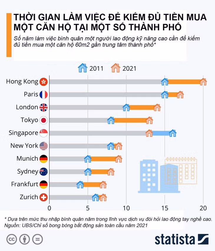Theo Chỉ số bong bóng bất động sản toàn cầu năm 2021 của UBS, một người lao động kỹ năng cao làm việc với mức lương bình quân trong lĩnh vực dịch vụ phải mất tới 20 năm mới có thể đủ tiền mua một căn hộ rộng 60 m2 tại khu vực trung tâm Hồng Kông (Trung Quốc). Thời gian này tại Paris (Pháp) và London (Anh) lần lượt là 20 và 17 năm.