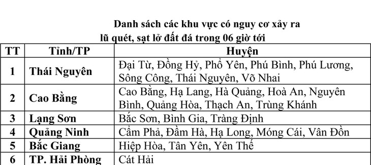 Trung tâm cảnh báo, trong 3 - 6 giờ tới, khu vực các tỉnh trên tiếp tục có mưa với lượng mưa tích lũy phổ biến 20 - 40 mm, có nơi trên 60 mm, riêng các tỉnh Cao Bằng và Lạng Sơn từ 30 - 50 mm, có nơi trên 80 mm.