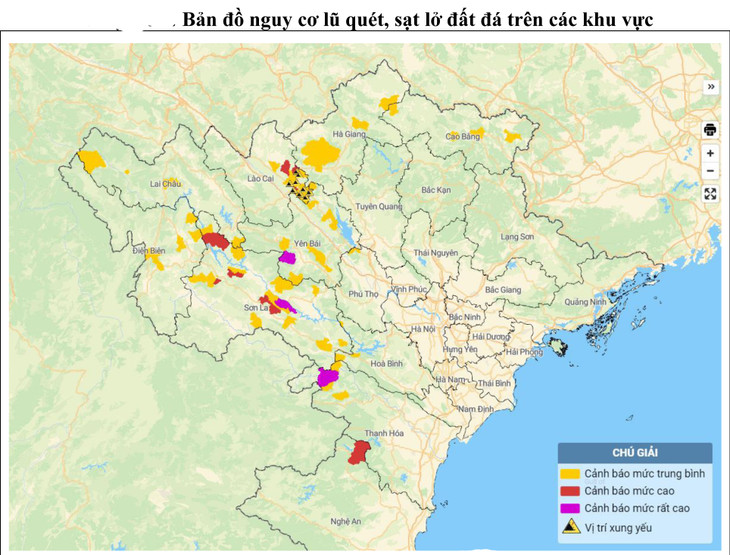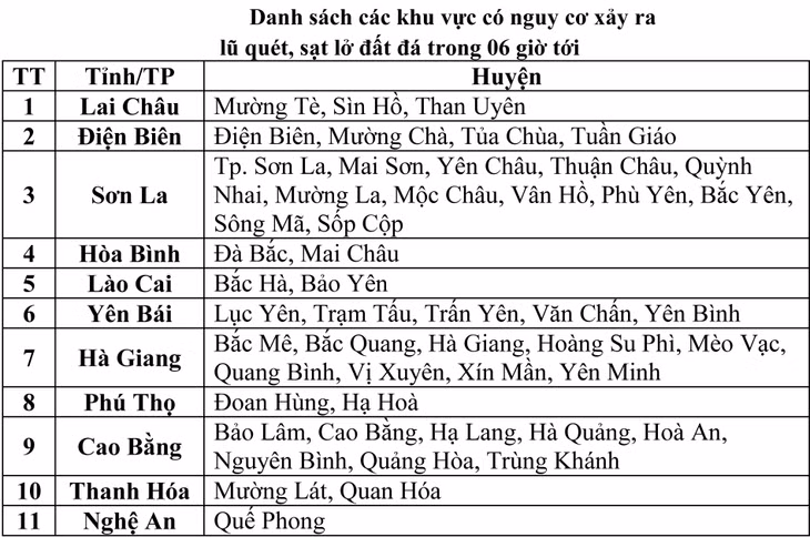 Trung tâm cảnh báo, trong 6 giờ tới, nguy cơ xảy ra lũ quét trên các sông, suối nhỏ, sạt lở đất trên sườn dốc tại nhiều huyện. Cảnh báo cấp độ rủi ro thiên tai do lũ quét, sạt lở đất, sụt lún đất do mưa lũ hoặc dòng chảy là Cấp 1.