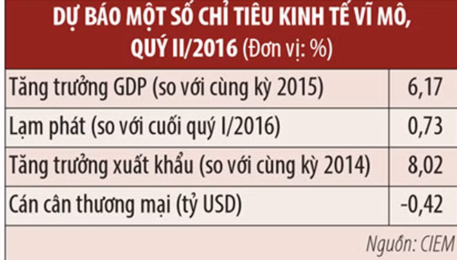 Dựa trên những tính toán theo mô hình kinh tế lượng vĩ mô, sử dụng số liệu quý, CIEM dự báo tăng trưởng GDP quý II đạt 6,17%. Tăng trưởng xuất khẩu dự báo ở mức 8,02%, thấp hơn so với cùng kỳ 2015 (đạt 9,28%); thâm hụt thương mại ở mức 0,42 tỷ USD, chủ yếu do cầu đầu tư và nhập khẩu tăng; CPI tăng khoảng 0,73%, cao hơn mức 0,65% cùng kỳ năm 2015.