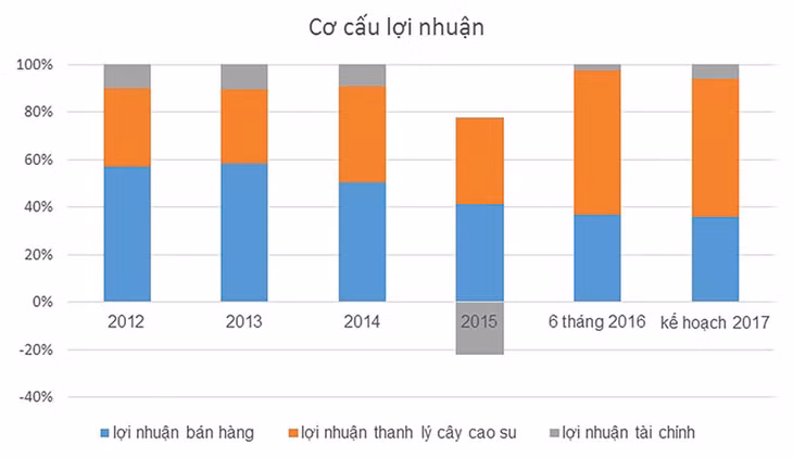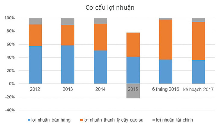 Nếu năm 2013, tỷ trọng lợi nhuận từ thanh lý cây cao su trên tổng lợi nhuận là 33% thì đến năm 2014 và 2015 tỷ trọng đã chiếm 40% và 65% trong tổng lợi nhuận. Tính đến thời điểm 30/6/2016, doanh thu bán cao su của Cao su Phú Riềng chỉ đạt 359 tỷ đồng và lợi nhuận gộp từ mảng này là 39 tỷ đồng. Trong khi đó doanh thu thanh lý cao su là 81 tỷ đồng và lợi nhuận đạt 64 tỷ đồng, đóng góp tới 60% tổng lợi nhuận của Công ty.