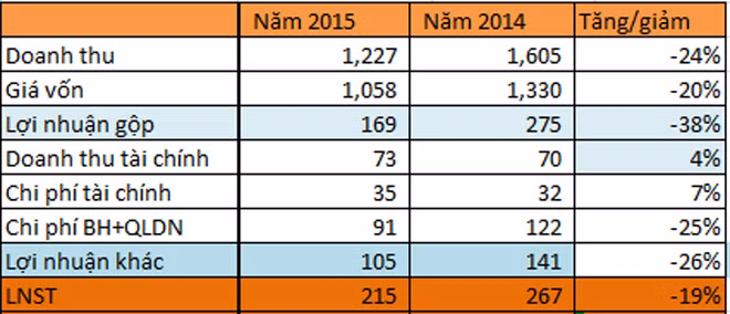 Doanh thu thuần cả năm công ty đạt 1.227 tỷ đồng, giảm 24% so với năm 2014 nhưng vẫn vượt 10% chỉ tiêu doanh thu cả năm.Tuy nhiên, giá vốn hàng bán giảm ít hơn, ở mức 20%, dẫn đến lợi nhuận gộp từ bán hàng và cung cấp dịch vụ còn 169 tỷ đồng, giảm 38%.