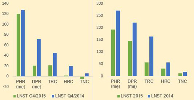 Theo đó, riêng quý 4/2015 mức lãi cao nhất thuộc về công ty mẹ Cao su Phước Hòa (PHR) với gần 120 tỷ đồng, tuy nhiên con số này cũng giảm 6% so với cùng kỳ. Công ty mẹ cao su Đồng Phú và cao su Tây Ninh cũng lần lượt báo lãi trên dưới 20 tỷ đồng giảm quá nửa so với cùng kỳ năm ngoái. Đáng chú ý, cao su Hòa Bình và cao su Thống Nhất không có lực đỡ từ lãi hoạt động khác khiến HRC lãi vỏn vẹn 1,62 tỷ đồng giảm 92% so với cùng kỳ, cá biệt TNC báo lỗ gần 5 tỷ đồng trong khi cùng kỳ LNST đạt 5,5 tỷ đồng, trước đó TNC cũng đã lên kế hoạch lỗ 2,5 tỷ đồng trong quý 4/2015.