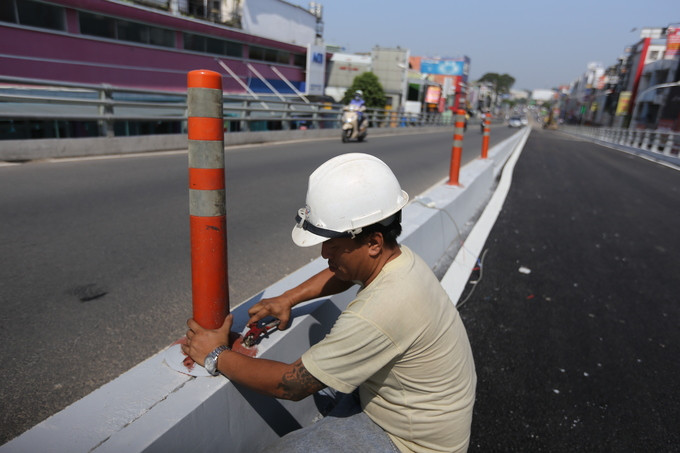 Công nhân lắp cọc tiêu giao thông phản quang để phân làn tại đoạn giao giữa hai nhánh cầu vượt trên đường Nguyễn Oanh.
