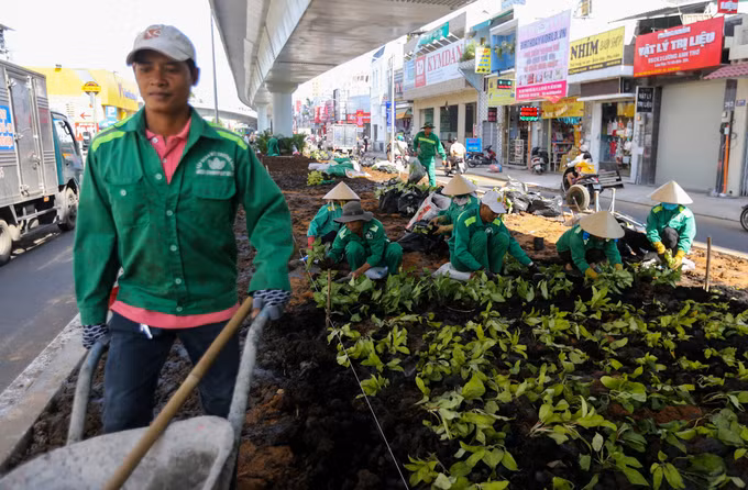 Dưới gầm cầu, hàng chục công nhân tích cực hoàn thiện mảng xanh.