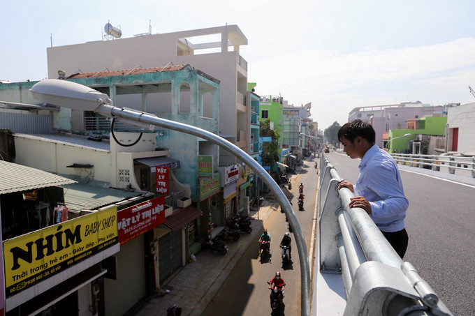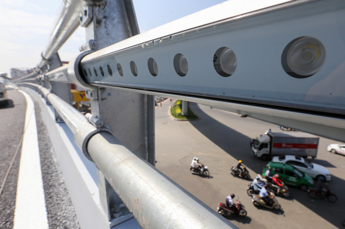 Sát mép cầu vượt là các cột đèn chiếu sáng cũng được lắp đặt để đủ cung cấp ánh sáng cho con đường Phạm Ngũ Lão.