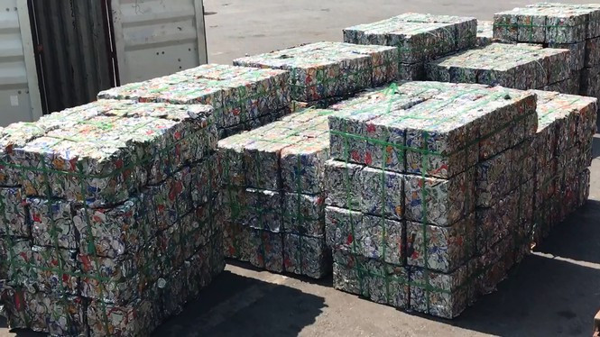 Trên tờ khai hải quan, doanh nghiệp khai báo là ống thép tròn mạ kẽm, thuế xuất khẩu khẩu 0%, là hàng được hệ thống thông quan luồng xanh. Sau khi chuyển luồng để kiểm tra, đơn vị phát hiện trong 4 container toàn bộ là vỏ nhôm phế liệu gồm vỏ lon bia, lon nước ngọt được ép thành khối lên đến gần 100 tấn, mặt hàng này có mức thuế xuất khẩu 22 %.