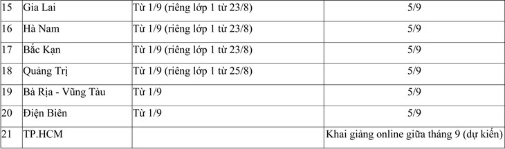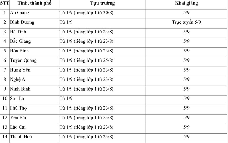 Theo công bố của các địa phương này, học sinh sẽ tựu trường vào ngày 1/9, riêng với lớp 1 là từ 23/8. Ngày khai giảng vào 5/9.
