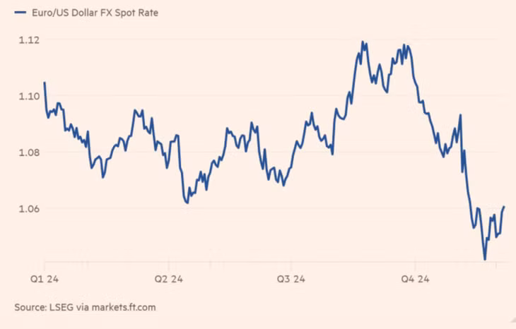 Giá tài sản châu Âu đã giảm mạnh trong bối cảnh thị trường chuẩn bị đón nhận chính sách “Nước Mỹ trên hết” của ông Trump trong 4 năm tới. Từ cuối tháng 9 đến nay, đồng tiền chung châu Âu euro đã giảm giá hơn 5% so với đồng USD xuống còn khoảng 1,06 USD đổi 1 euro, do giới đhà đầu tư kỳ vọng Ngân hàng Trung ương châu Âu (ECB) sẽ phải giảm lãi suất xuống sâu hơn nhằm bù đắp cho triển vọng ảm đạm của các nhà xuất khẩu trong khu vực.