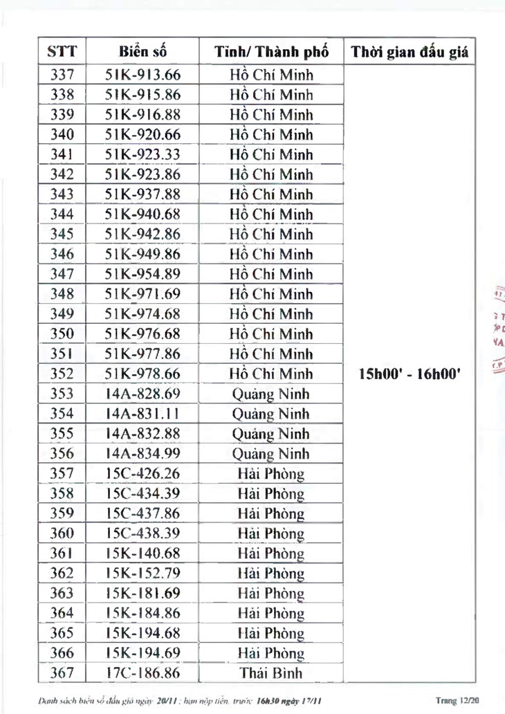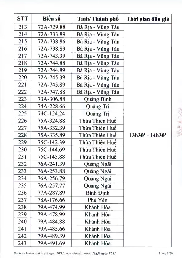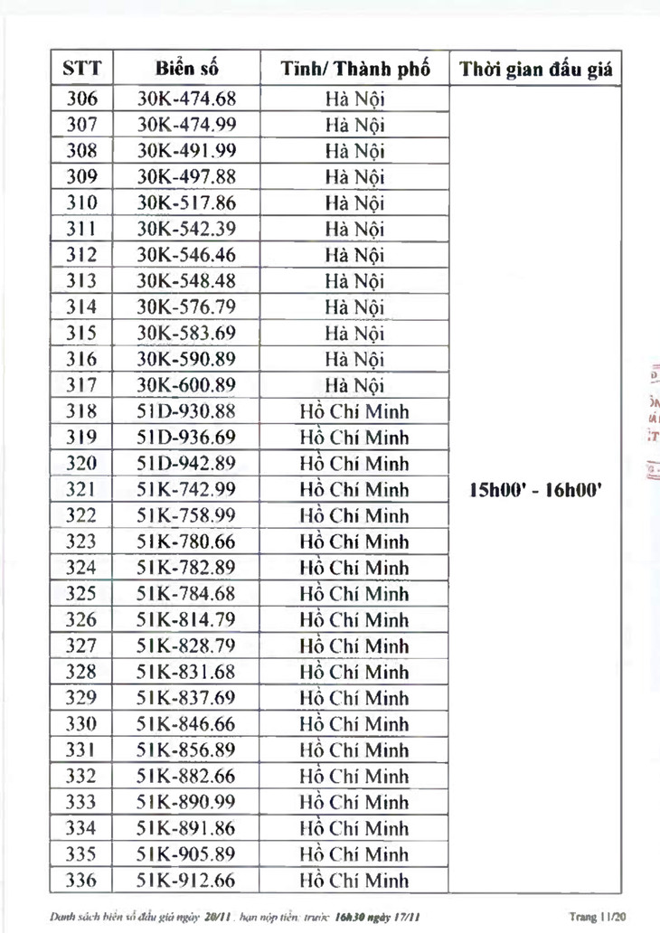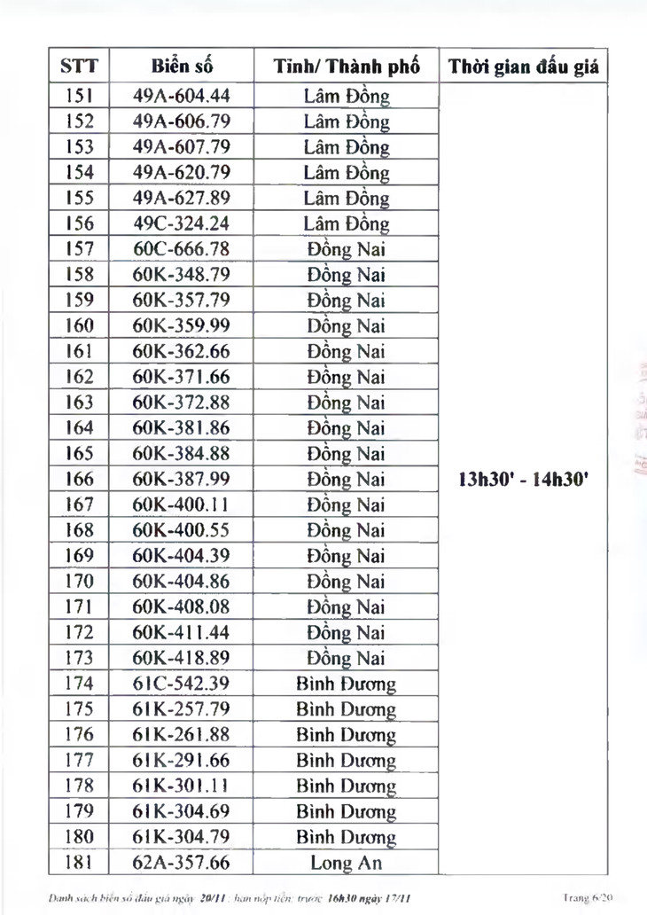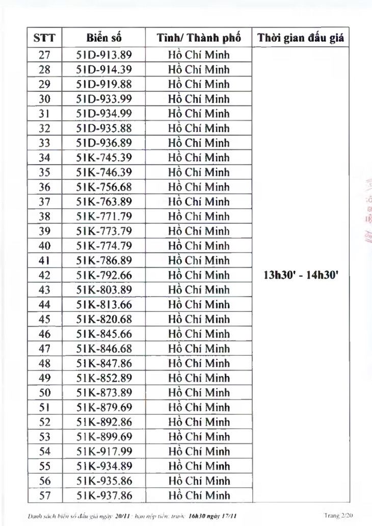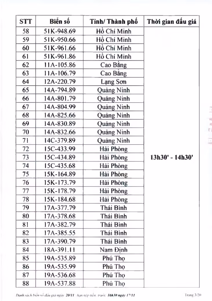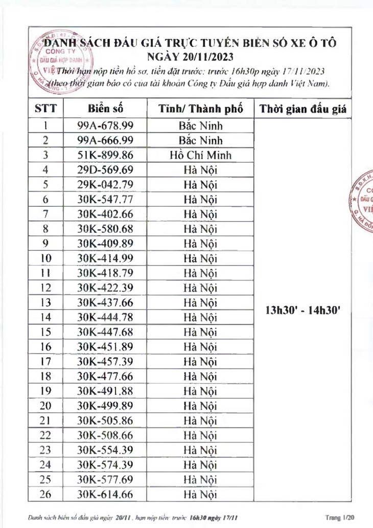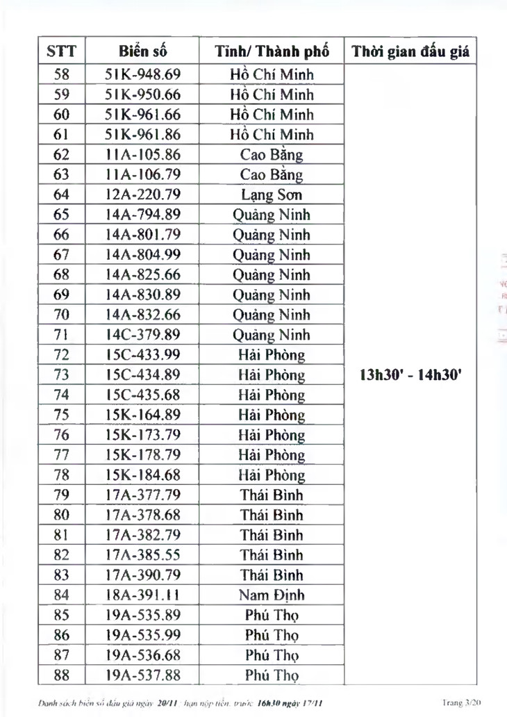 Sau đây là danh sách biển số ô tô và các phiên đấu giá trực tuyến chiều ngày 20/11: