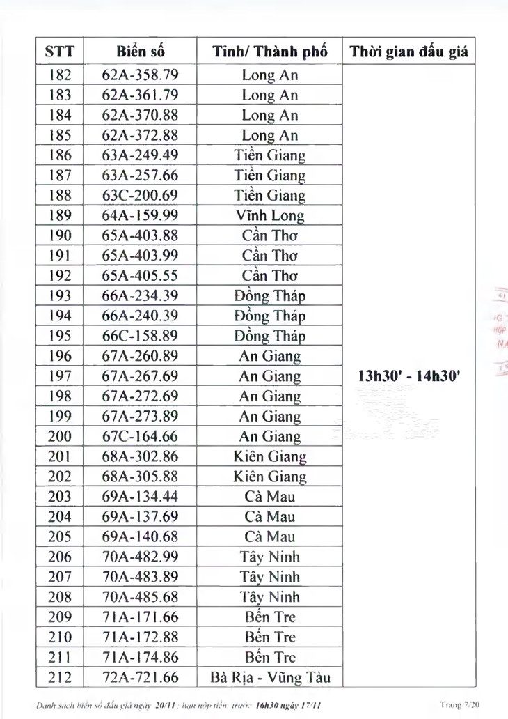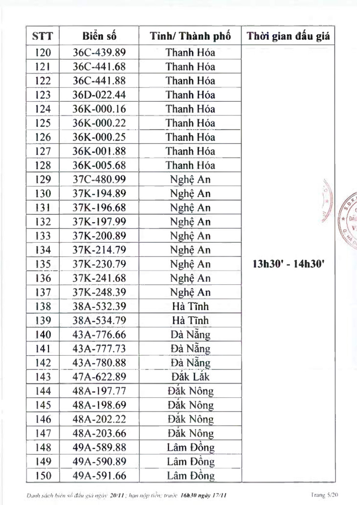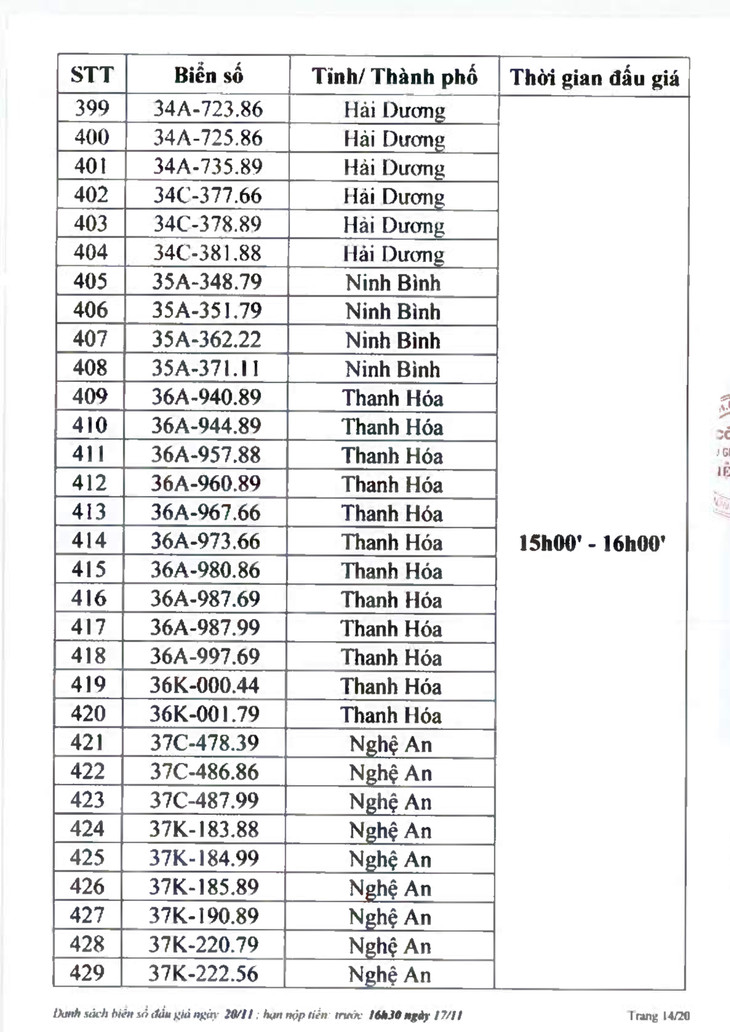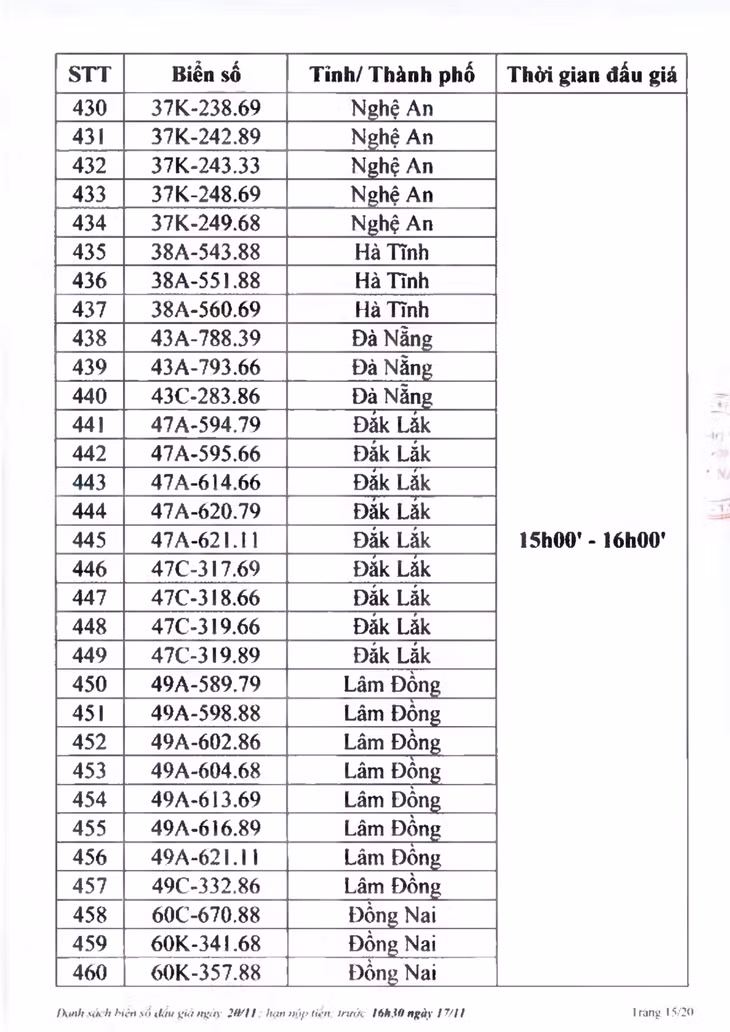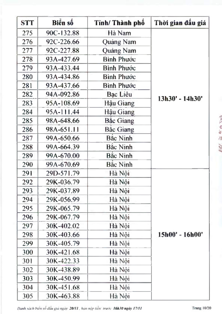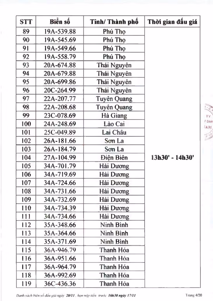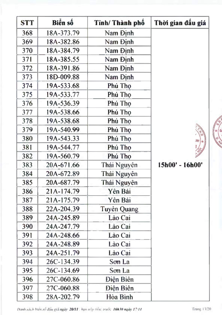 Sau đây là danh sách biển số ô tô và các phiên đấu giá trực tuyến chiều ngày 20/11: