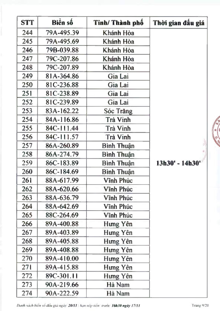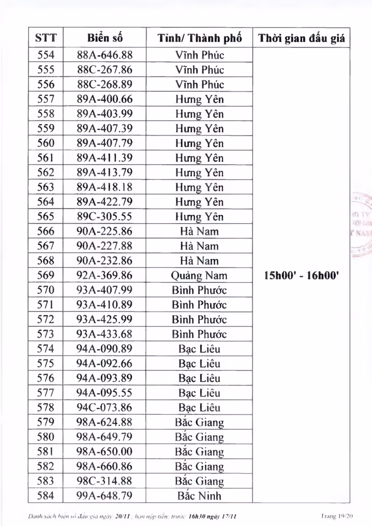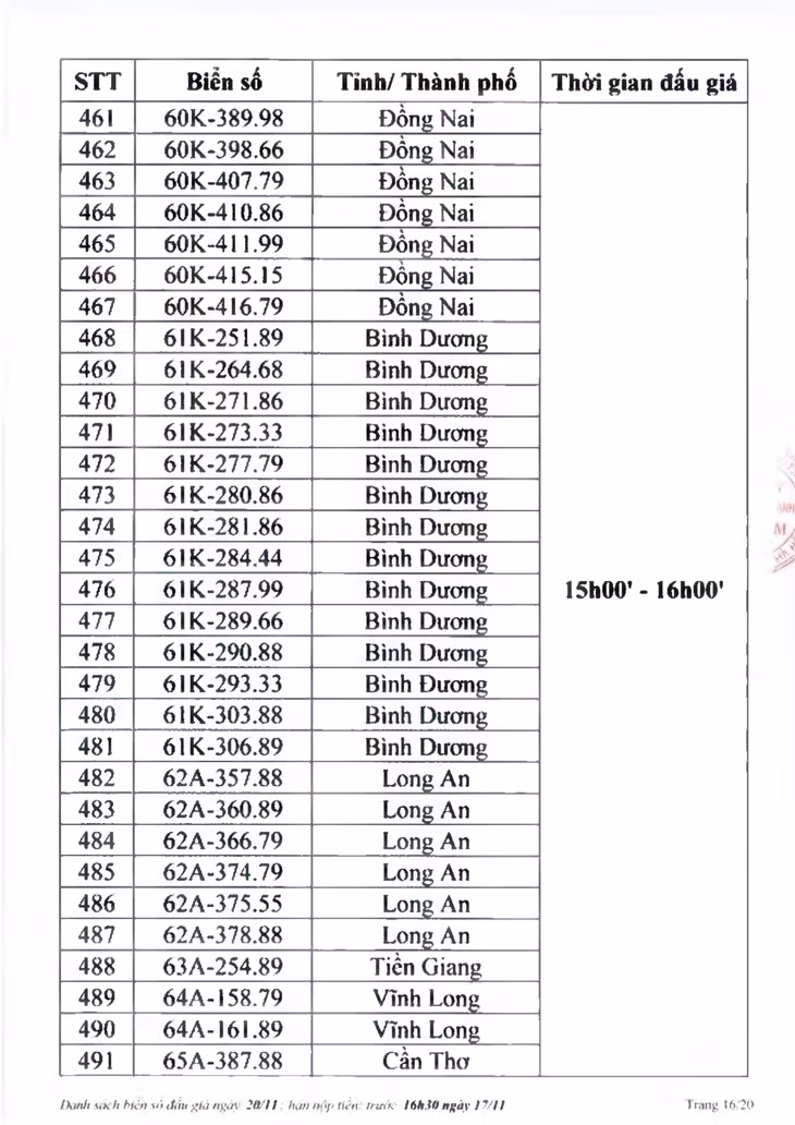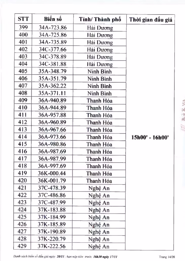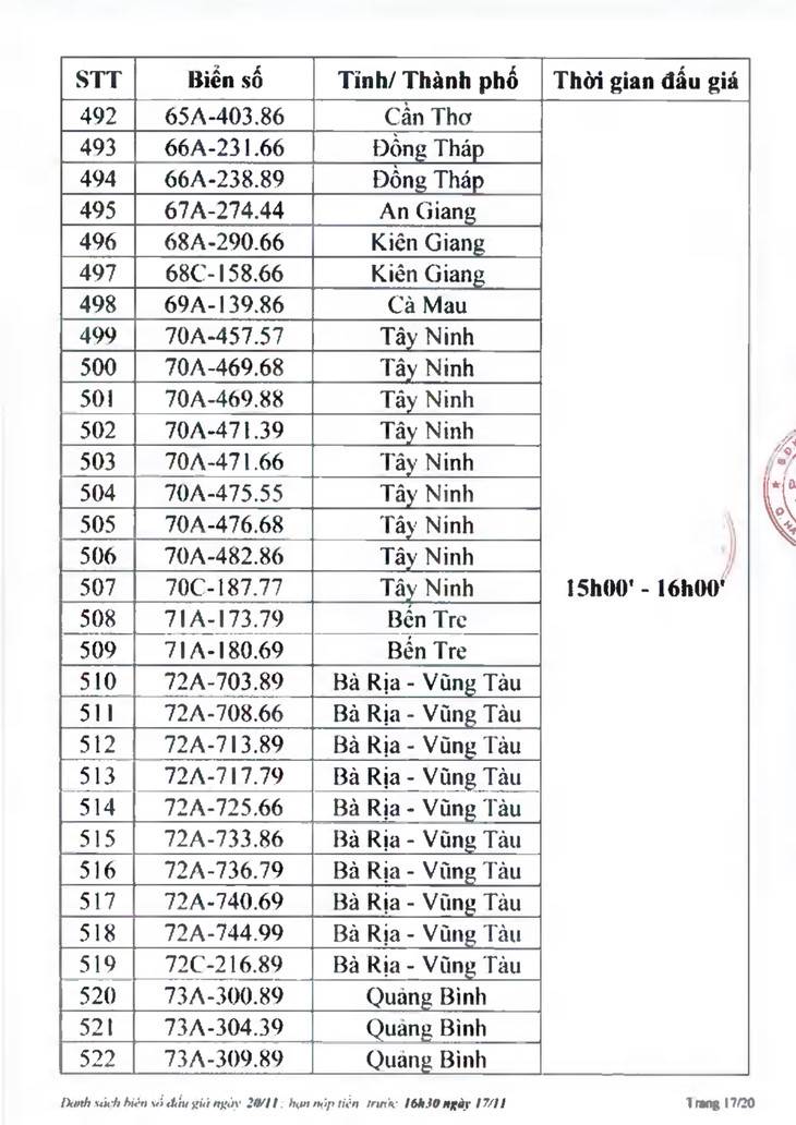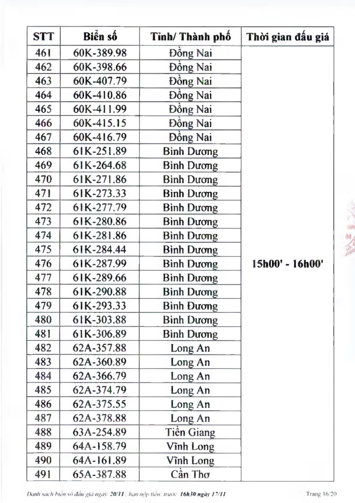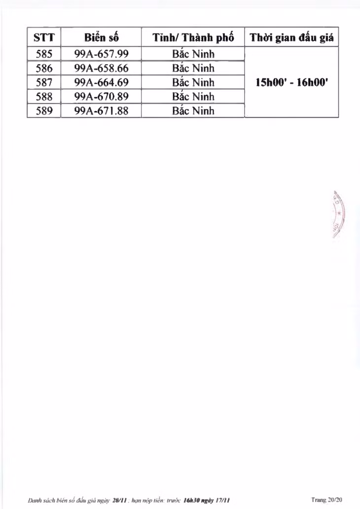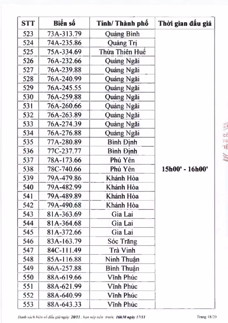 Sau đây là danh sách biển số ô tô và các phiên đấu giá trực tuyến chiều ngày 20/11:
