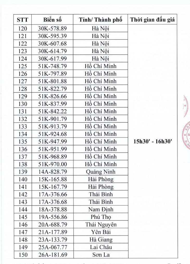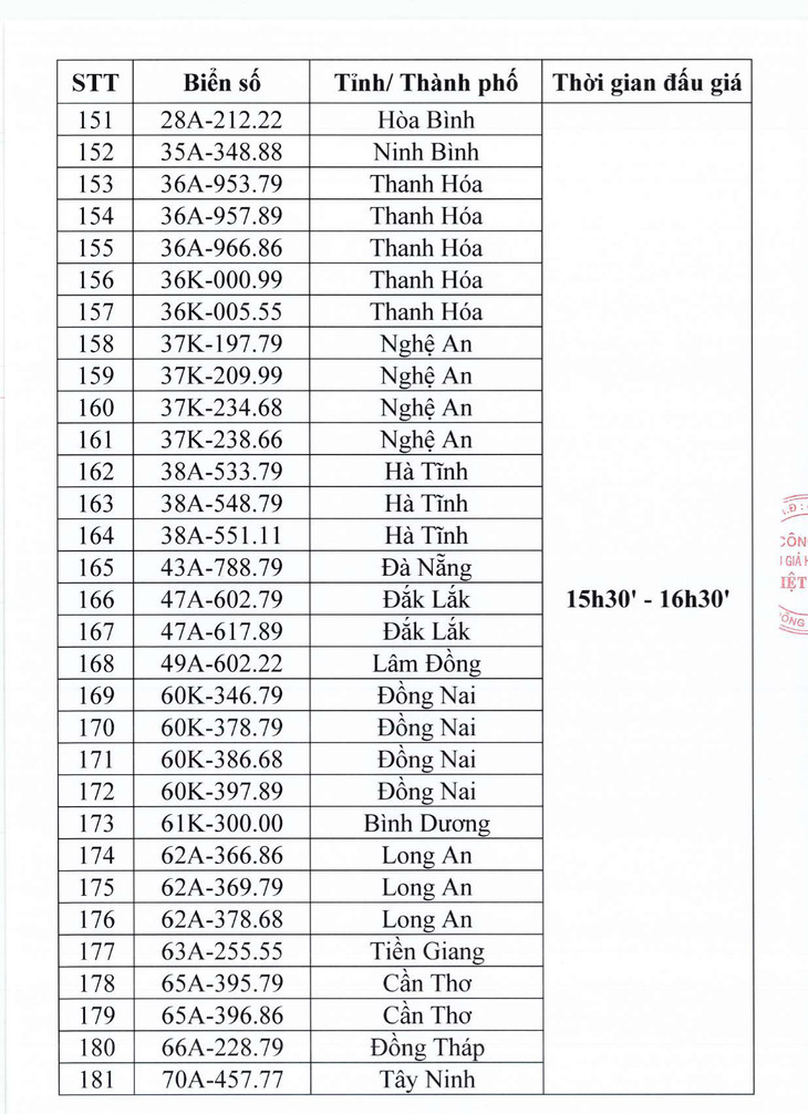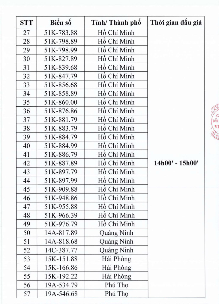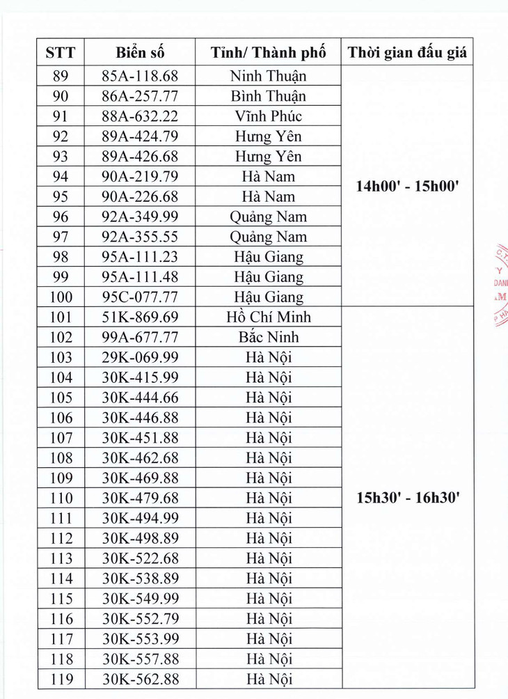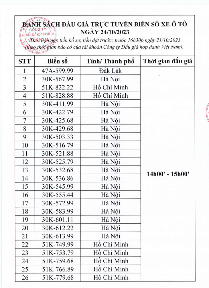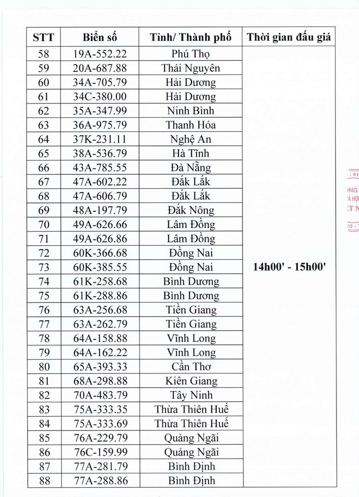 Công ty Đấu giá hợp danh Việt Nam (VPA) thông báo danh sách đấu giá trực tuyến biển số xe ô tô ngày 24/10. Theo đó, sẽ có 200 biển số sẽ lên sàn đấu giá vào chiều ngày 24/10. Các phiên đấu giá biển số ô tô sẽ được tổ chức tại 2khung giờ (14h00 - 15h00, 15h30 - 16h30).