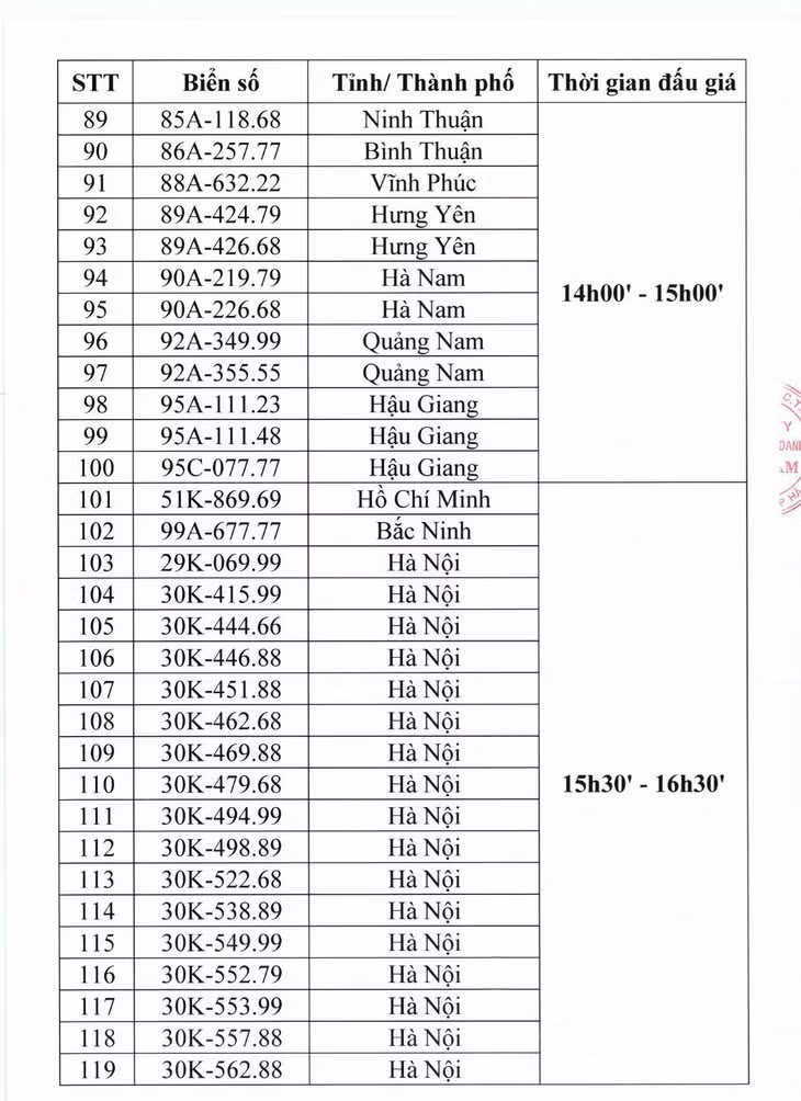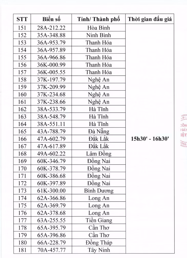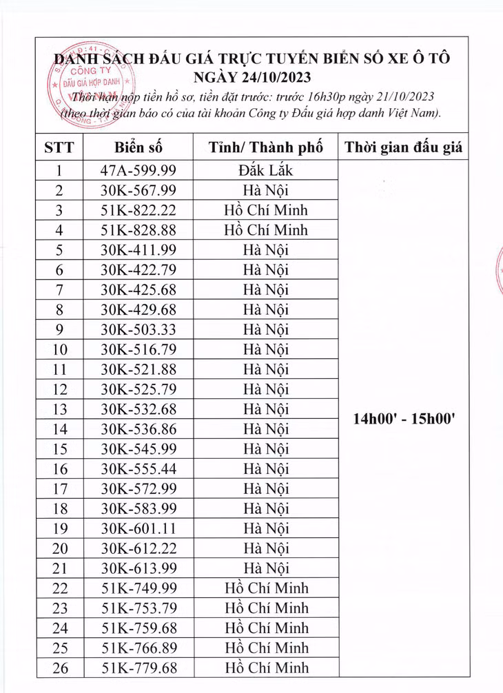 Sau đây là danh sách biển số ô tô và các phiên đấu giá trực tuyến ngày 24/10: