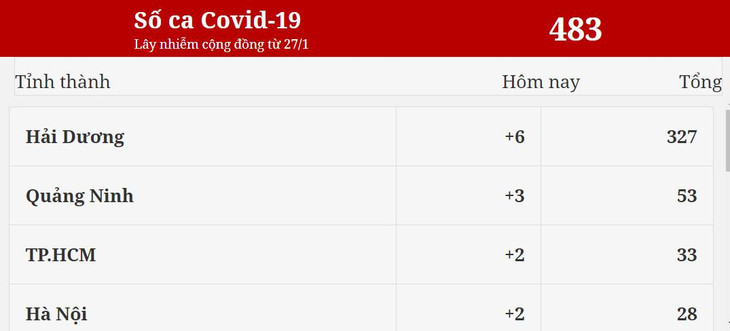 Thông tin ca mắc mới: 16 ca mắc mới (BN2054-BN2069), trong đó có 13 ca lây nhiễm cộng đồng (6 Hải Dương, 2 Hà Nội, 2 Hưng Yên, 2 TP.Hồ Chí Minh, 1 Gia Lai) và 03 ca nhập cảnh (1 Long An, 2 TP.Hồ Chí Minh). Cụ thể: