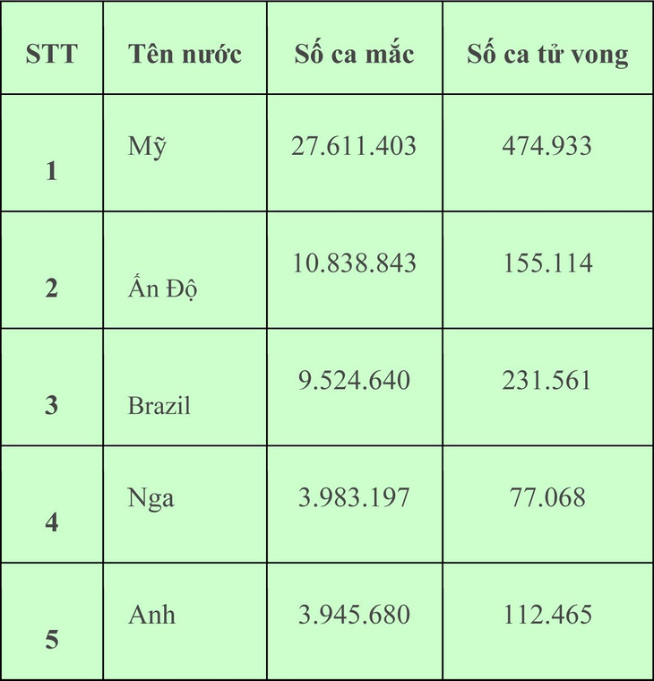 5 quốc gia có số ca mắc COVID-19 nhiều nhất thế giới gồm: