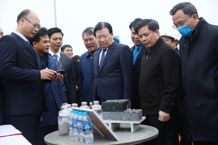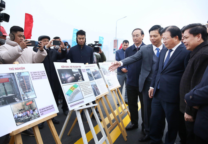 | Phó Thủ tướng Chính phủ Trịnh Đình Dũng đánh giá cao những nỗ lực của Bộ Giao thông vận tải và các nhà thầu thi công trong việc sửa chữa cầu Thăng Long lần này. Ảnh: Lê Tiên |