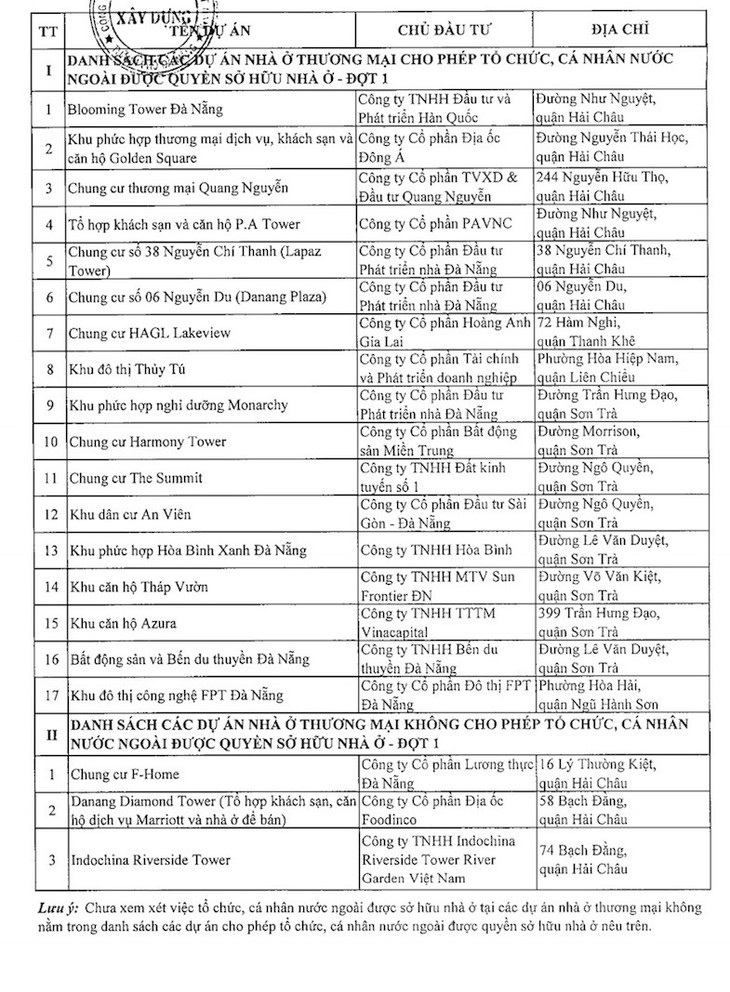 Theo văn bản, 17 dự án nhà ở thương mại cho phép tổ chức, cá nhân nước ngoài được quyền sở hữu nhà ở. 8/17 dự án thuộc quận Sơn Trà, quận Hải Châu có 6 dự án. Các quận Thanh Khê, Ngũ Hành Sơn, Liên Chiểu đều có một dự án.