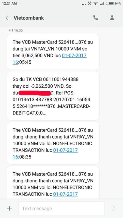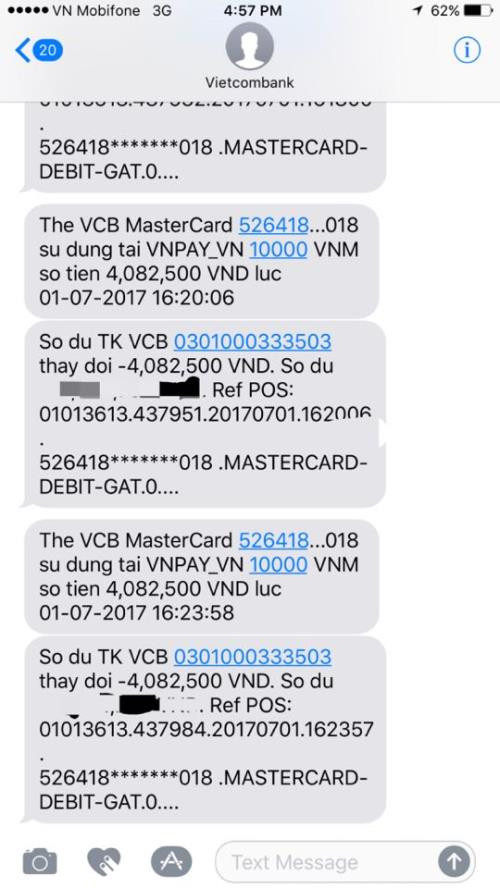 Theo phản ánh của anh Nguyễn Sơn Tùng (31 tuổi, Hà Nội), vào chiều 1/7 vừa qua, tài khoản Vietcombank của anh bỗng nhiên bị trừ tiền theo các giao dịch nhỏ 2-4 triệu đồng qua website thanh toán vnpay.vn. Tổng số tiền bị mất khoảng 20 triệu đồng. Lúc đó không có máy tính trước mặt nên chủ thẻ đã ngay lập tức liên hệ lên tổng đài Vietcombank để khóa thẻ.