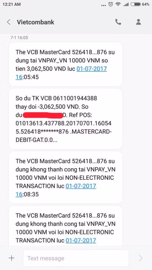 Cụ thể, vào khoảng 4h chiều 1/7, anh Tâm nhận được tin nhắn trừ tiền từ Vietcombank báo thanh toán qua cổng VNPAY với số tiền hơn 3 triệu đồng. Ngay lập tức, anh Tâm đã đăng nhập vào tài khoản Internet Banking để khóa tài khoản thì thấy báo có thêm 2 giao dịch khác nữa nhưng không bị trừ tiền.