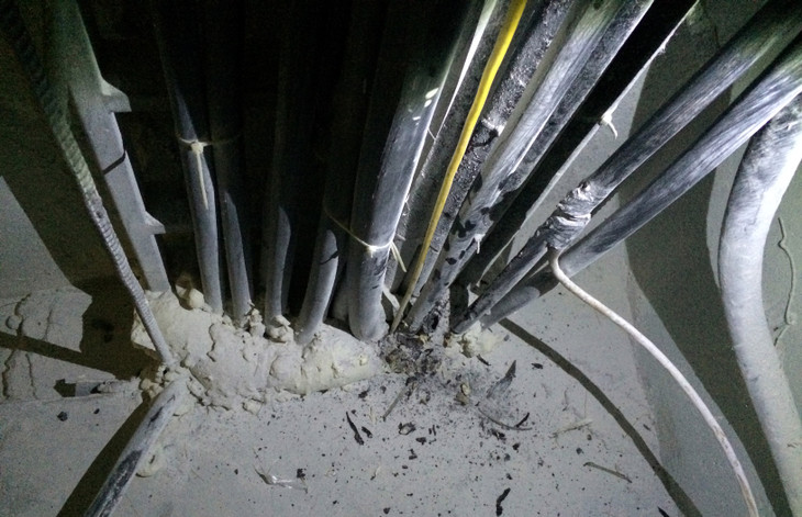 Đưa phóng viên Báo Đấu thầu đi tìm hiểu một vòng chung cư này, anh Tiến, một nhân viên kỹ thuật của chung cư Thăng Long Garden chỉ cho chúng tôi thấy, chất lượng của đường dây điện ở đây rất kém, rủi ro chập điện gây cháy là vô cùng lớn. Mặc dù dây diện to bằng ngón tay út nhưng lõi của 2 dây bên trong lại rất nhỏ, chỉ là nhôm mạ đồng, xuất xứ từ Trung Quốc. Không chỉ ở nơi xảy ra 5 vụ cháy nêu trên, tầng hầm của chung cư hiện vẫn còn nguyên tình trạng nhiều đoạn dây điện, bóng đèn chập cháy đen ngòm cả một mảng trần.