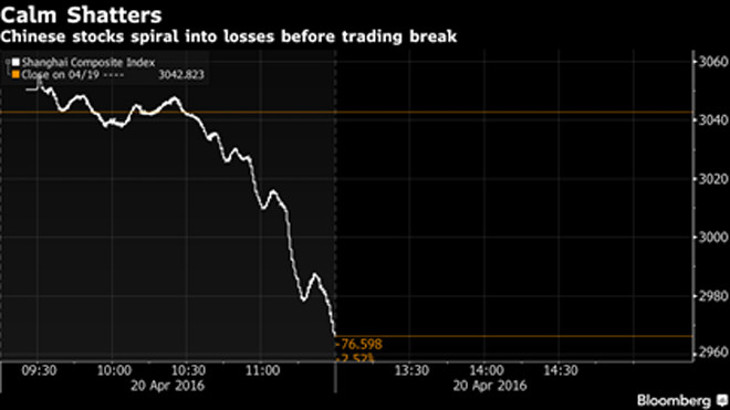 Chỉ số Shanghai Composite giảm 2,6%, với đà giảm đột ngột chỉ trong 1 giờ trước khi kết thúc giờ giao dịch buổi sáng. Trong số đó, các công ty tiêu dùng và công nghệ dẫn đầu đà giảm. Chỉ số Hang Seng China Enterprises giảm từ mức cao nhất 3 tháng tại Hong Kong, trong đó cổ phiếu của China Telecom Corp và China Shenhua Energy Co giảm hơn 4%.