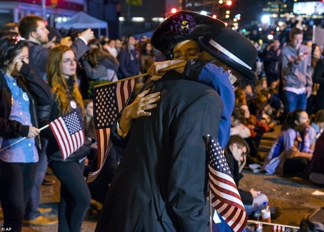 Cô con gái đang an ủi mẹ mình giữa đống hỗn độn bên ngoài trung tâm hội nghị Jacob Javis, nơi bà Clinton dự định tổ chức tiệc đêm bầu cử. Ảnh: AP