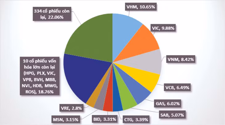 Sự chao đảo của thị trường trong thời gian vừa qua xuất phát từ sự giảm giá mạnh của các công ty có vốn hóa lớn. Bởi chỉ riêng 10 mã lớn nhất đã chiếm tỷ trọng 60% vốn hóa của thị trường. Vì vậy, khi thị giá của các cổ phiếu này giảm mạnh trong thời gian qua đã khiến chỉ số VN-Index bay mất hơn 20% kể từ đỉnh 1.200 điểm thiết lập ngày 9/4.