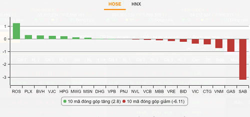Cổ phiếu SAB cũng trở thành "tội đồ" trong phiên giao dịch ngày hôm nay khi trở thành mã chứng khoán có tác động mạnh nhất tới VN-Index. Với việc mất 7% giá trị, cổ phiếu của Sabeco kéo VN-Index giảm 3,2 điểm, đóng góp quá nửa trong tổng số 10 mã có tác động giảm mạnh nhất lên thị trường.