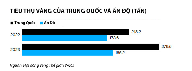Trung Quốc và Ấn Độ thường thay nhau giữ vị trí nước tiêu thụ vàng nhiều nhất thế giới. Năm ngoái, vị trí này thuộc về Trung Quốc khi tiêu thụ vàng trang sức, vàng miếng và vàng xu của nước này đều tăng vọt. Theo dữ liệu từ Hội đồng Vàng Thế giới (WGC), nhu cầu vàng trang sức tại Trung Quốc năm 2023 tăng 10%, trong khi tại Ấn Độ giảm 6%. Trong khi đó, nhu cầu vàng miếng và xu vàng của Trung Quốc tăng tới 28%.