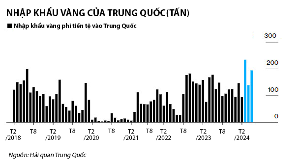 Theo dữ liệu từ Bloomberg Intelligence, từ tháng 6/2023, lượng tiền đầu tư vào các quỹ ETF vàng tại Trung Quốc đại lục gần như tháng nào cũng tăng, ngược lại với xu hướng rút tiền khỏi các quỹ ETF vàng trên thế giới. Tính từ đầu năm 2024, tổng lượng tiền rót vào các quỹ ETF vàng ở Trung Quốc đại lục là 1,3 tỷ USD, trong khi lượng tiền rút khỏi các quỹ tương tự trên thế giới là khoảng 4 tỷ USD. Theo các nhà phân tích, một nguyên nhân cho xu hướng này là nhà đầu tư Trung Quốc không có nhiều kênh đầu tư thay thế cho bất động sản và chứng khoán.