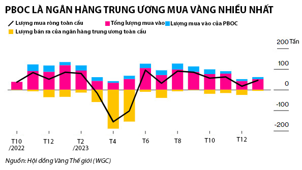 Ngân hàng Trung ương Trung Quốc (PBOC) đã mua vàng suốt 17 tháng liên tiếp, kể từ tháng 11/2022 – giai đoạn mua vào dài nhất từ trước tới nay, trong bối cảnh cơ quan này muốn đa dạng hóa dự trữ khỏi đồng USD và bảo vệ đồng nội tệ. Năm 2023, cơ quan này mua thêm 225 tấn vàng, nâng dự trữ vàng lên 2.235 tấn, chiếm khoảng 4,3% dụ trữ ngoại hối chính thức của Trung Quốc.