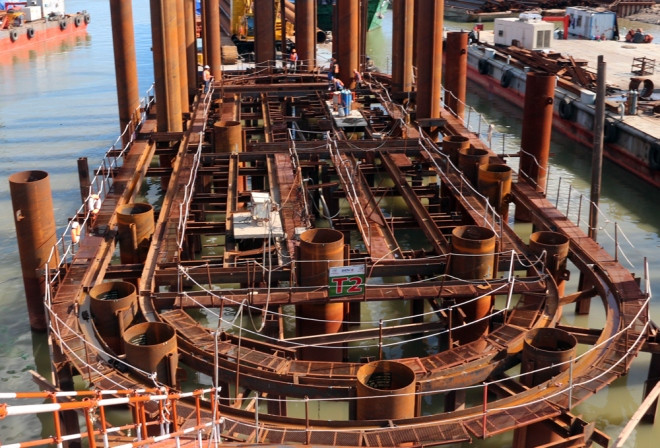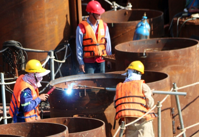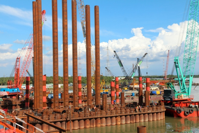 Công nhân tất bật tại công trường cống Mương Chuối (huyện Nhà Bè). Theo đơn vị đầu tư, công trường luôn có khoảng 500 công nhân, kĩ sư làm việc.