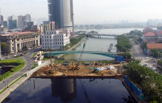 Công trình cống ngăn triều Bến Nghé gần cầu Móng ở quận 1 đã hoàn thành việc ngăn dòng, chuẩn bị công tác thi công.