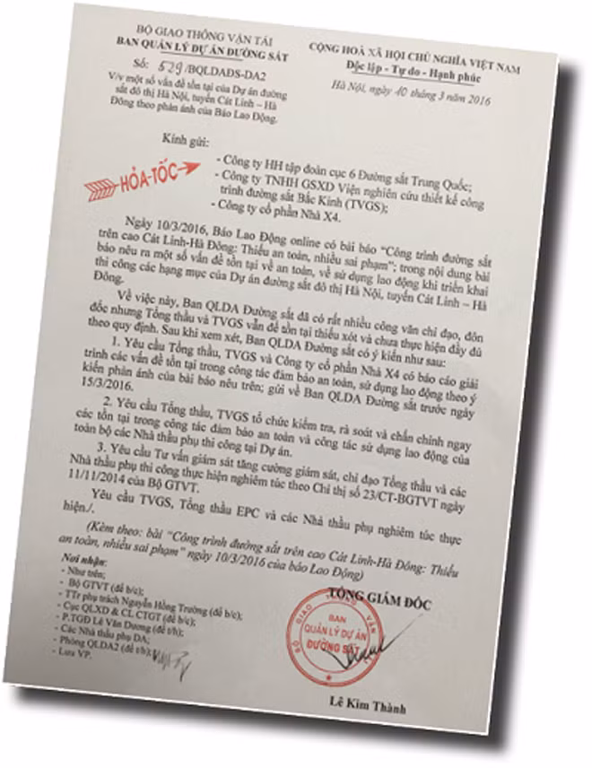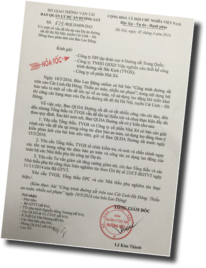 Ngay sau khi Báo chúng tôi ra số báo ngày 10.3 có bài “Công trình đường sắt trên cao Cát Linh-Hà Đông: Thiếu an toàn, nhiều sai phạm”, ngay trong chiều 10.3, Ban quản lý dự án Cát Linh- Hà Đông đã gửi công văn hỏa tốc yêu cầu Tổng thầu - Cục đường sắt 6 Trung Quốc, tư vấn giám sát và công ty cổ phần nhà X4 có báo cáo giải trình các vấn đề tồn tại trong công tác đảm bảo an toàn, sử dụng lao động theo nội dung phản ánh của bài báo.