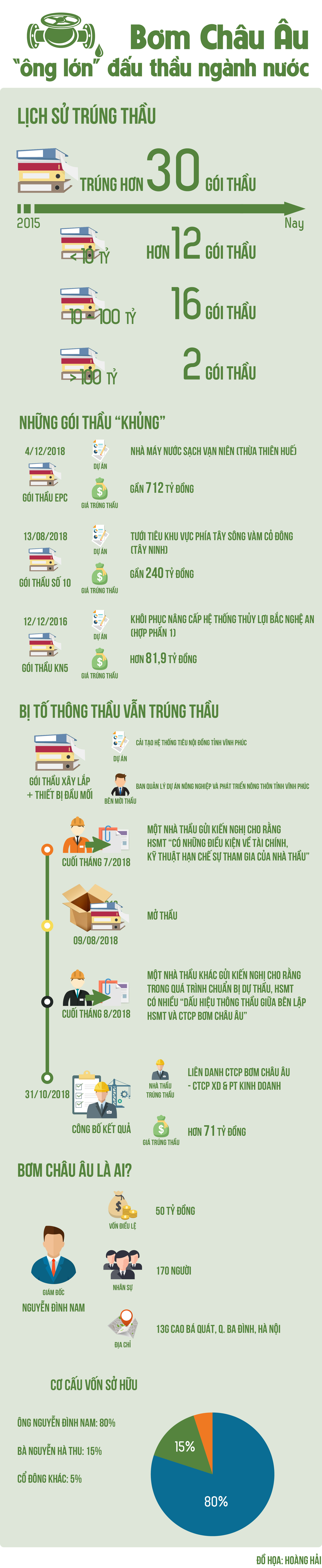 (BĐT) - Trong khoảng thời gian 3 năm gần đây, với số vốn điều lệ 50 tỷ đồng, Công ty CP Bơm Châu Âu (quận Ba Đình, TP. Hà Nội) đã trúng hơn 30 gói thầu trên phạm vi cả nước. Trong đó có những gói thầu "khủng" lên tới trên 200 tỷ đồng và cả những gói thầu để lại không ít "tai tiếng".
