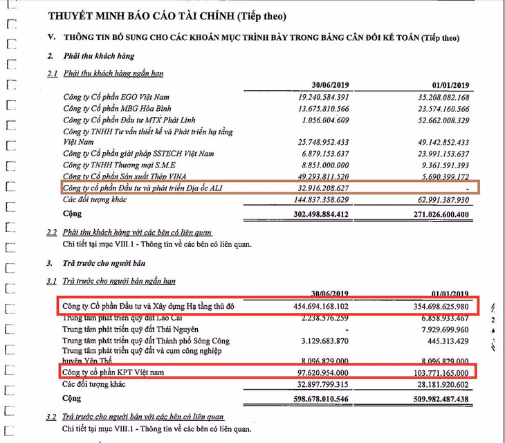 Bên cạnh đó, báo cáo tài chính bán niên 2019 tiếp tục xuất hiện các khoản trả trước của KOSY cho Công ty CP Đầu tư và Xây dựng hạ tầng Thủ đô và Công ty CP KPT Việt Nam với giá trị lần lượt là 454,6 tỷ đồng (tăng 100 tỷ đồng so với thời điểm đầu năm) và 97,6 tỷ đồng (giảm 5 tỷ đồng so với thời điểm đầu năm).