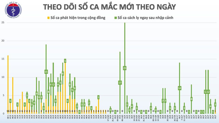 Tính đến 18h ngày 25/7: Việt Nam có tổng cộng 417 ca mắc COVID- 19, trong đó 276 ca nhiễm nhập cảnh được cách ly ngay. Tính từ 6h đến 18h ngày 25/7, ghi nhận 2 ca mắc mới.