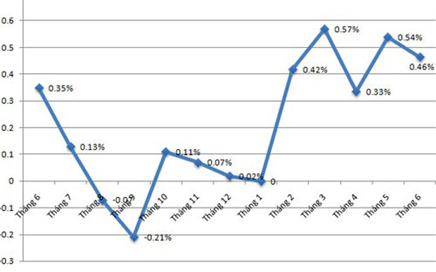 Tổng cục Thống kê vừa công bố chỉ số giá tiêu dùng (CPI) tháng 6/2016 đã tăng 0,46% so với tháng trước và tăng 2,4% so với cùng kỳ năm trước. Như vậy, sau nửa năm, CPI đã tăng 2,35% so với tháng 12 năm trước, cao gần gấp 5 lần CPI của tháng 6 năm 2015 với cùng mốc so sánh.