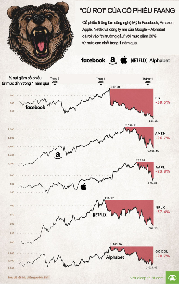 (BĐT) - 5 ông lớn công nghệ Mỹ là Facebook, Amazon, Apple, Netflix và công ty mẹ của Google - Alphabet đã mất hơn 1 nghìn tỷ USD vốn hóa trong tuần qua.