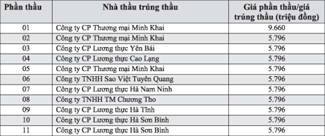 Tổng giá 11 phần thầu nêu trên là gần 68 tỷ đồng. Theo kết quả lựa chọn nhà thầu được Cục Dự trữ Nhà nước khu vực Hoàng Liên Sơn phê duyệt tại Công văn số 63/QĐ-CDTHLS ngày 30/3/2016 thì tổng giá trúng thầu của 11 phần thầu này không sai khác 1 đồng so với giá các phần thầu được duyệt.