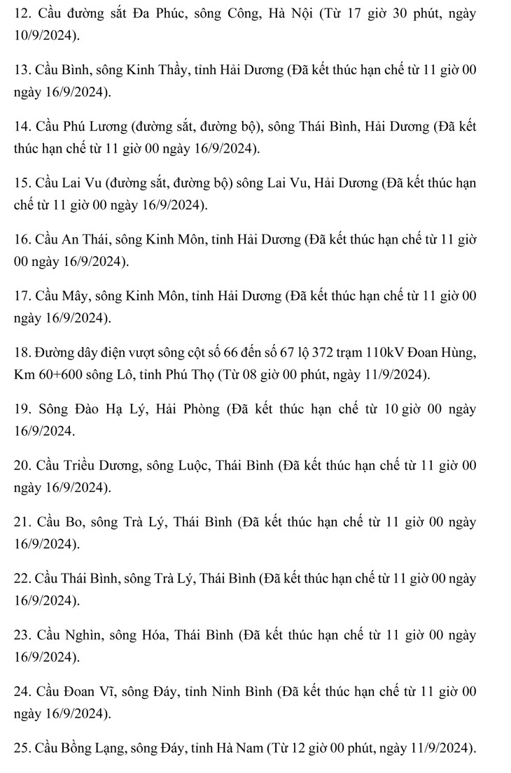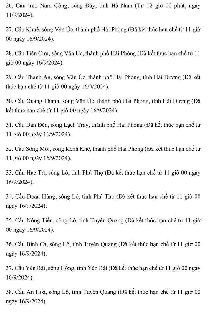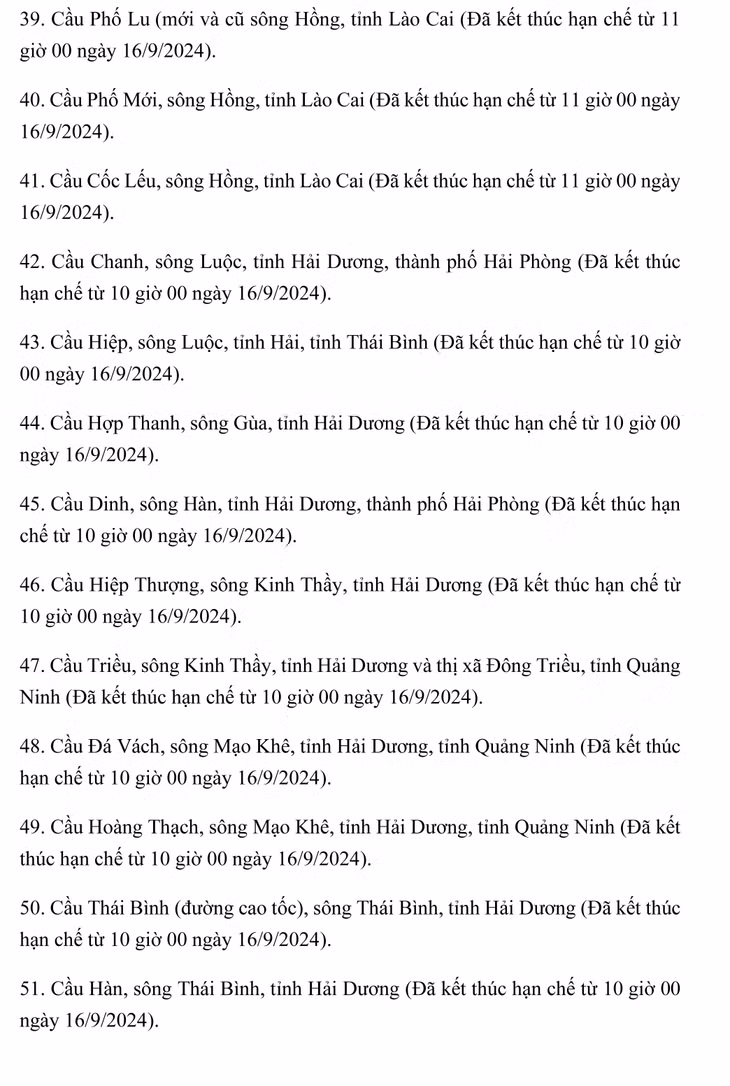 Theo đó có 51 vị trí tại 50 cầu đường bộ, đường sắt vượt sông và một vị trí có đường dây điện vượt sông Km 60+600 sông Lô (huyện Đoan Hùng, tỉnh Phú Thọ), cấm tất cả các phương tiện giao thông đường thủy nội địa lưu thông qua khu vực khoang thông thuyền các cầu này, trừ các phương tiện thực hiện nhiệm vụ: cứu hộ, cứu nạn, điều tiết hướng dẫn bảo đảm an toàn giao thông.