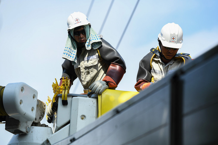 Không phải leo thang như truyền thống, nơi làm việc đặc biệt của thợ sửa điện sống là gầu xe cách điện. Trong không gian vỏn vẹn 2 mét giữa lưng chừng trời, nhiệt độ thực họ hấp thụ phải lên đến 50 độ C.