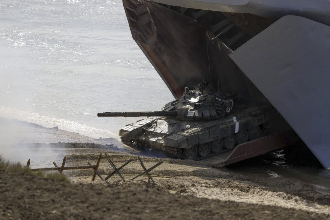 Nga cũng triển khai hệ thống phòng không S-400 trong cuộc tập trận này. Trong ảnh là các xe tăng, xe chiến đấu lao lên bãi biển, đánh chiếm các mục tiêu đầu cầu.