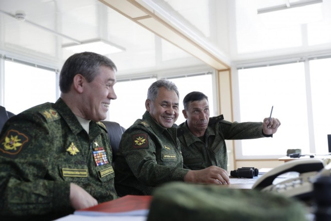 Bộ trưởng Quốc phòng Nga Sergei Shoigu (giữa), Tổng tham mưu trưởng Valery Gerasimov (trái) và Cục trưởng Cục huấn luyện chiến đấu Ivan Buvaitsev thị sát cuộc tập trận.