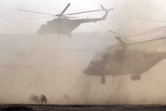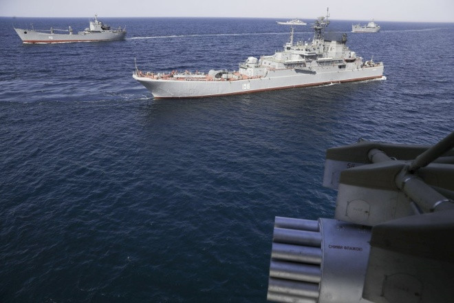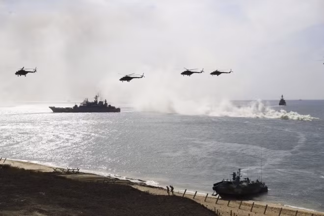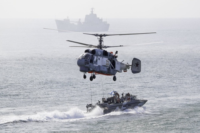 Trực thăng Nga hiệp đồng tác chiến với các tàu hải quân trong chiến dịch đổ bộ.