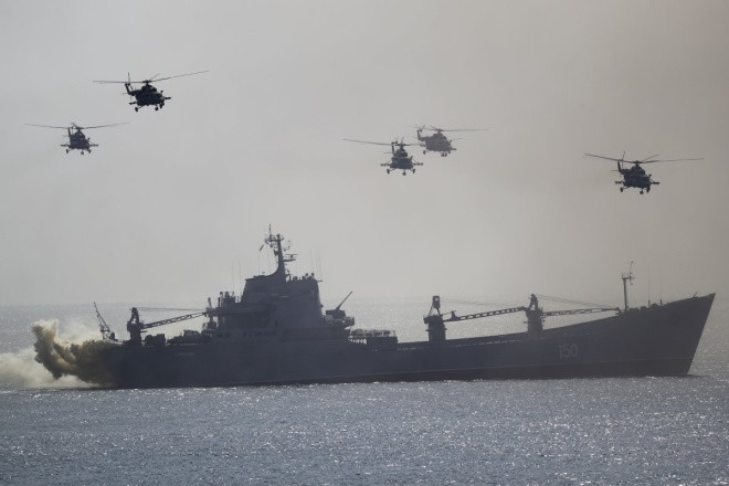 Kịch bản tập trận là bán đảo Crimea bị xâm chiếm, và Nga triển khai lực lượng để đẩy lùi cuộc tấn công bằng tên lửa hành trình, xe tăng, máy bay và tàu chiến triển khai trên Biển Đen. Trên ảnh là một tàu hải quân Nga và các trực thăng tham gia chiến dịch đổ bộ trong cuộc tập trận trên Biển Đen hôm 9/9.