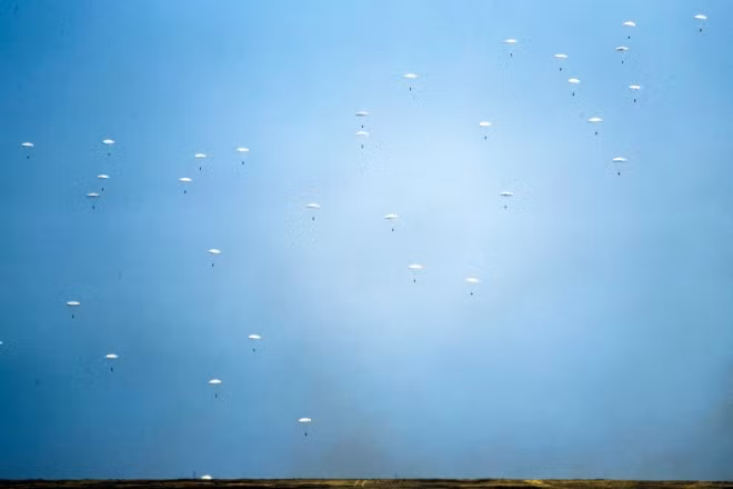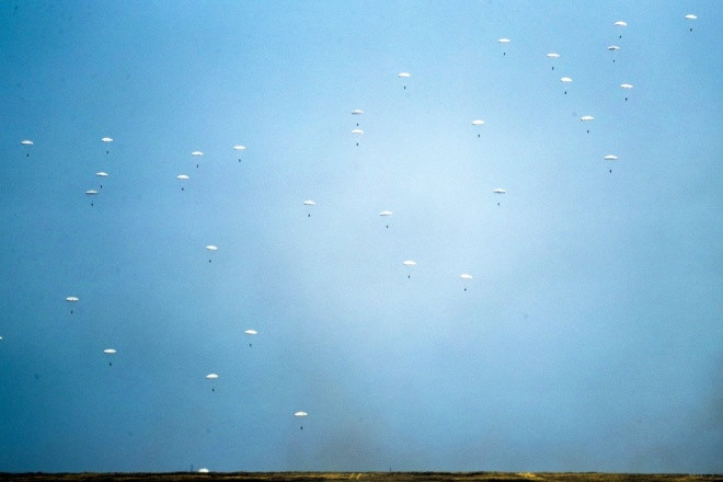 Lính dù Nga thực hành nhảy dù đánh chiếm mục tiêu trong cuộc tập trận.