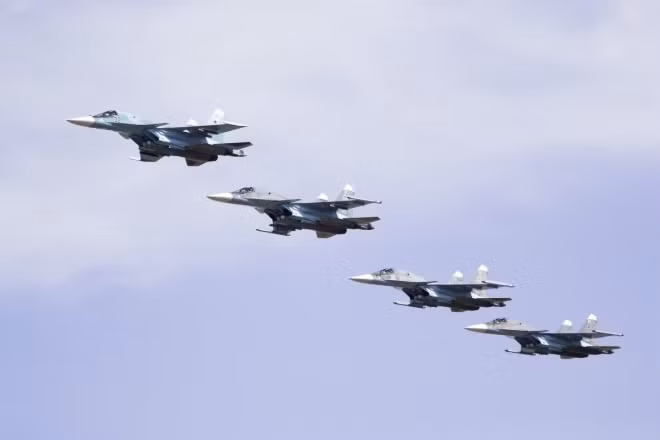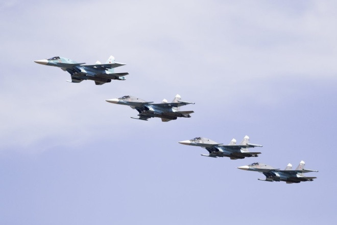 Tiêm kích bom Su-34 bay theo đội hình trong cuộc tập trận.