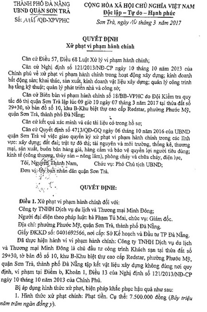 Theo tìm hiểu của phóng viên, dự án nêu trên được bắt đầu triển khai từ cuối năm 2015, Công ty TNHH Du lịch Dịch vụ và Thương mại Minh Đông có công văn xin khoan thử cọc tại công trình với số lượng là 3 cọc. Thế nhưng, thực tế, Công ty Minh Đông đã khoan 10 cọc/245 cọc. Cơ quan chức năng đã lập biên bản yêu cầu dừng thi công xây dựng công trình vi phạm.